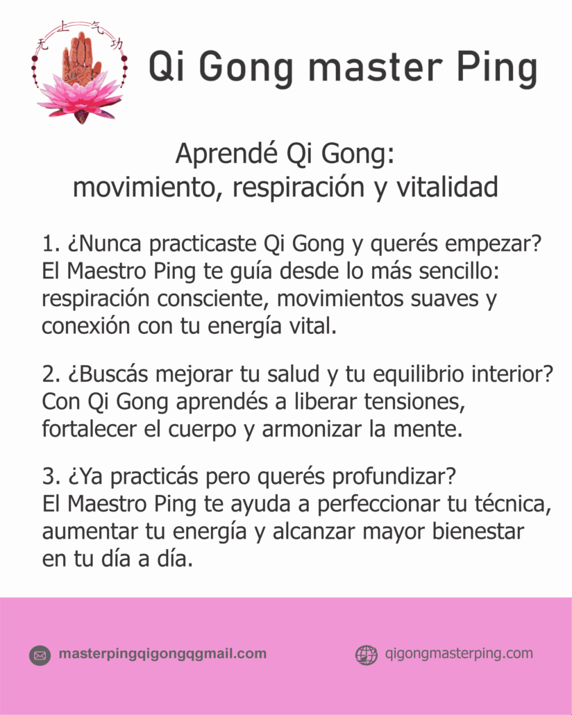 En conclusión, el Qi Gong es mucho más que un conjunto de ejercicios: es un camino que aporta armonía al corazón, la mente y la energía vital. Con la guía del Maestro Ping , tanto los principiantes como los practicantes avanzados encuentran un espacio de aprendizaje, crecimiento y éxito. Empezar esta práctica es regalarse la posibilidad de vivir con más salud, serenidad y plenitud.